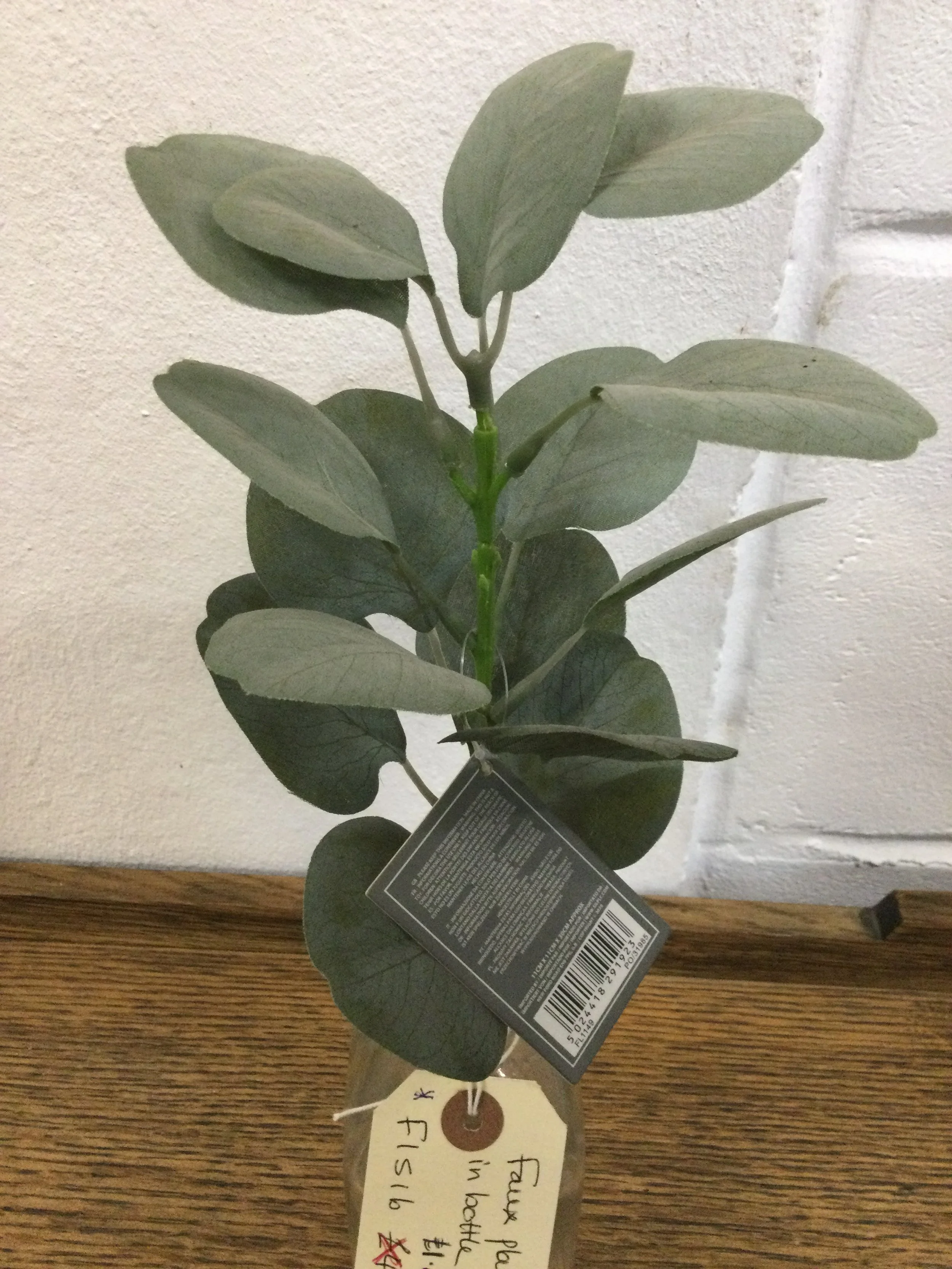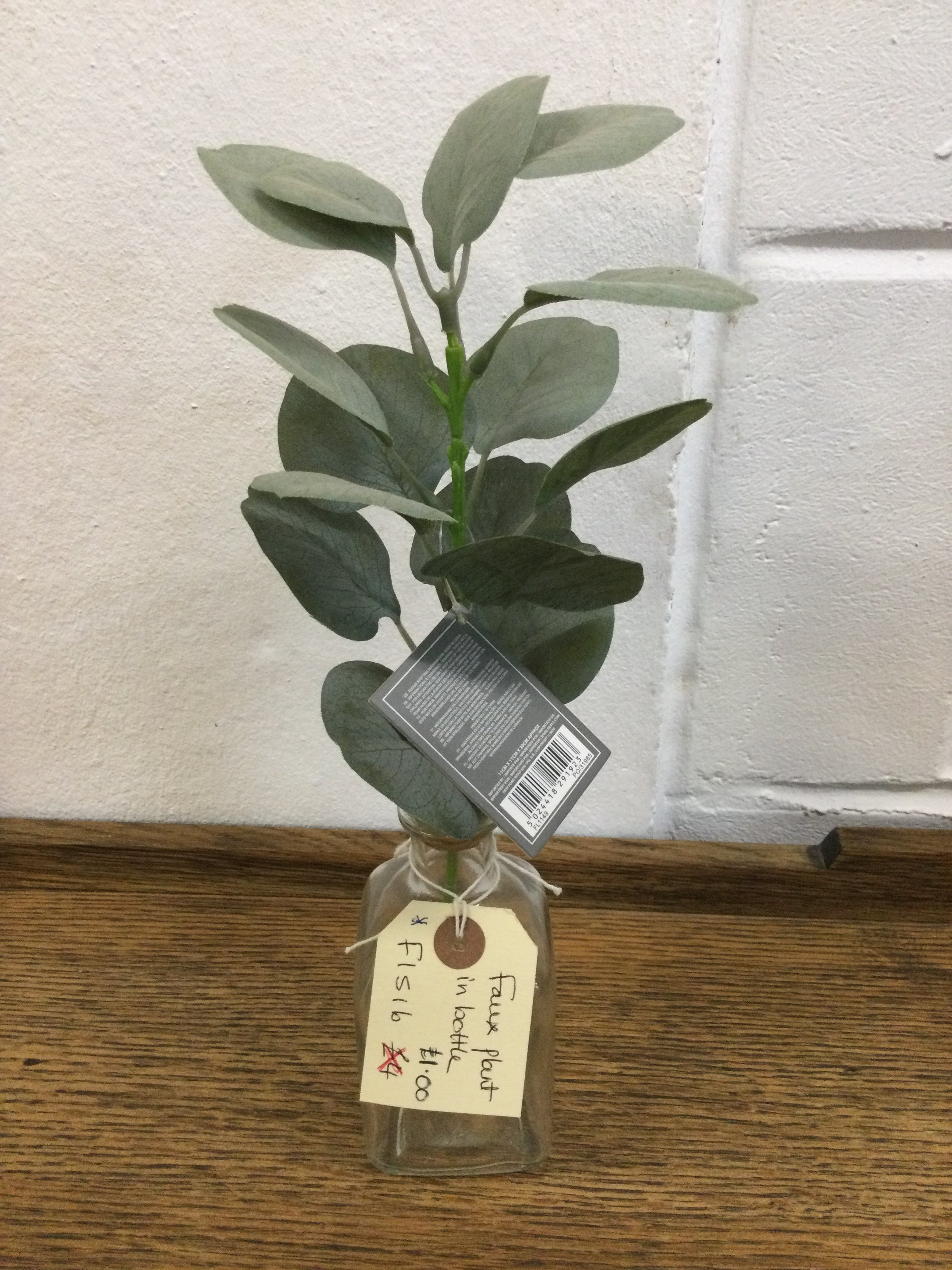 Artificial foliage stem which is secured in a glass bottle vase with a cork stopper. New with tags