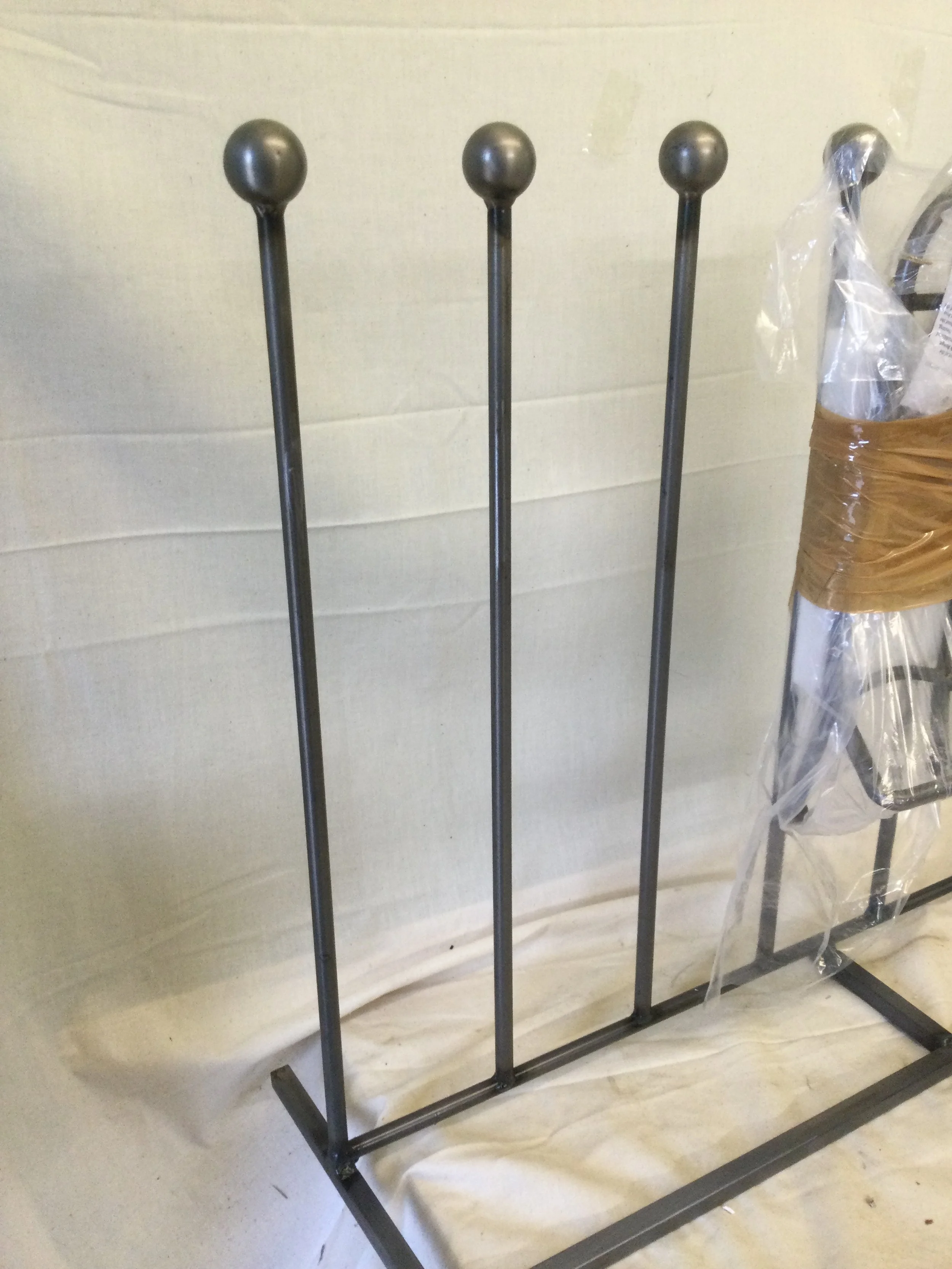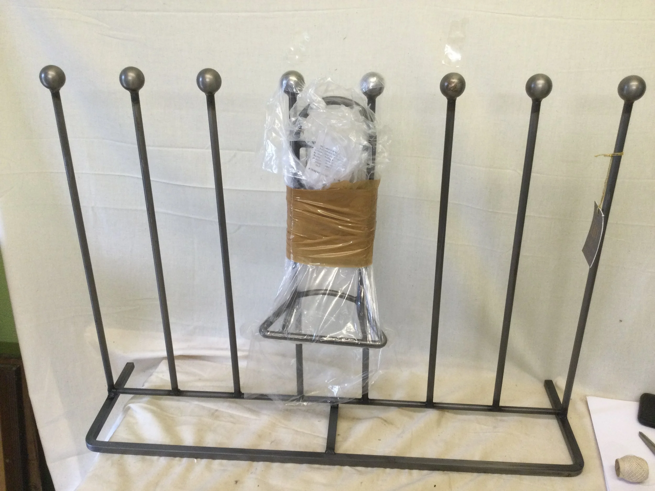 Large garden hanging wicker egg chair. It has a large white metal base and hanging column. The egg chair is white wicker with a grey cushion. It measures 250 cm tall x 135 cm diameter base. The chair is 96 cm wide x 108 cm tall x 80 cm deep, it is 55 cm from floor to seat. The hanging chain is 40 cm long