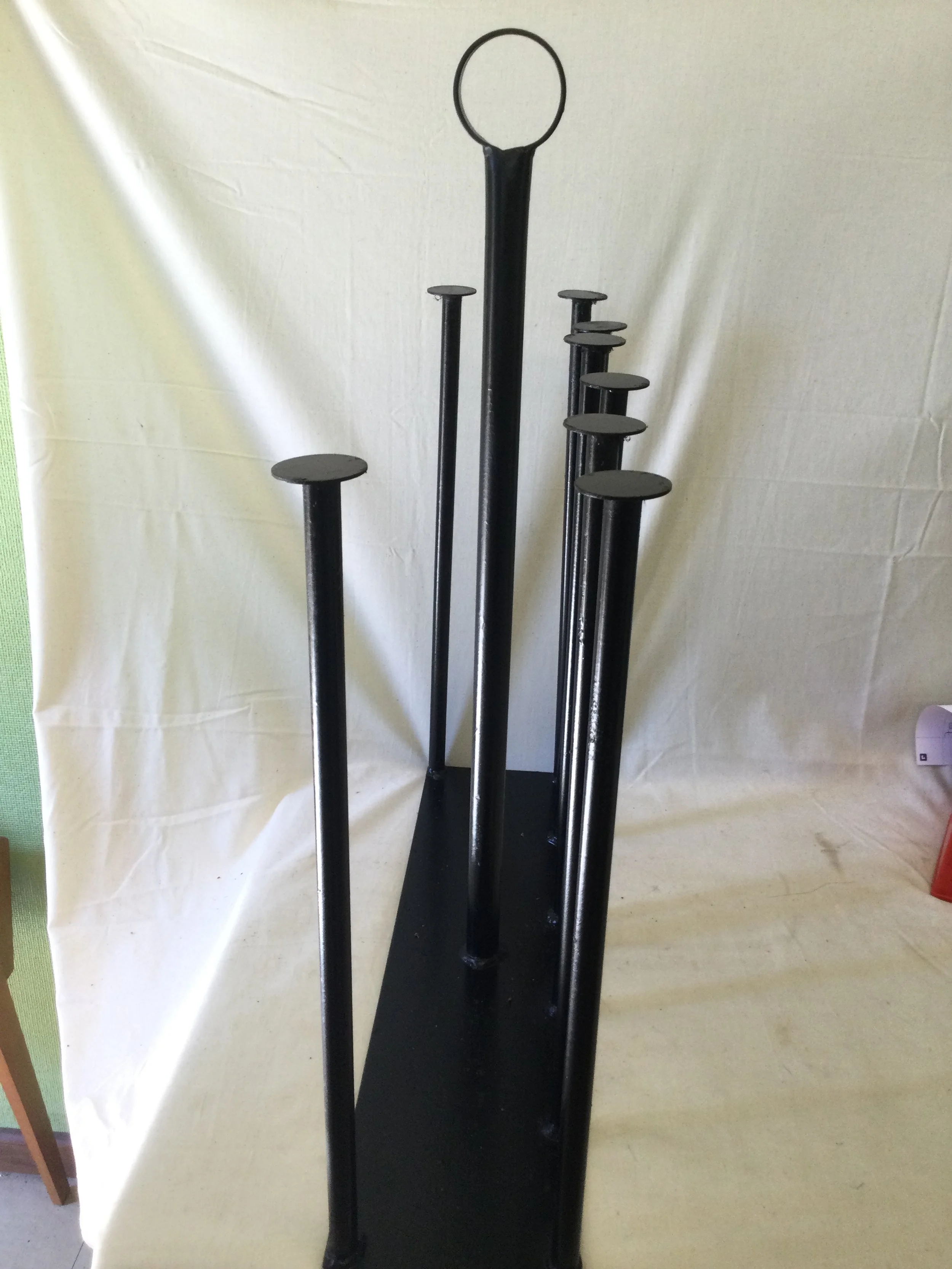 Pair of black metal framed bar stools with grey suede effect seats. Each one measures 48 cm deep x 41 cm wide x 104 cm tall. The footrest is 29 cm from the floor. Seat is 72 cm from the floor and is 45 cm wide x 33 cm deep. The backrest is 34 cm tall