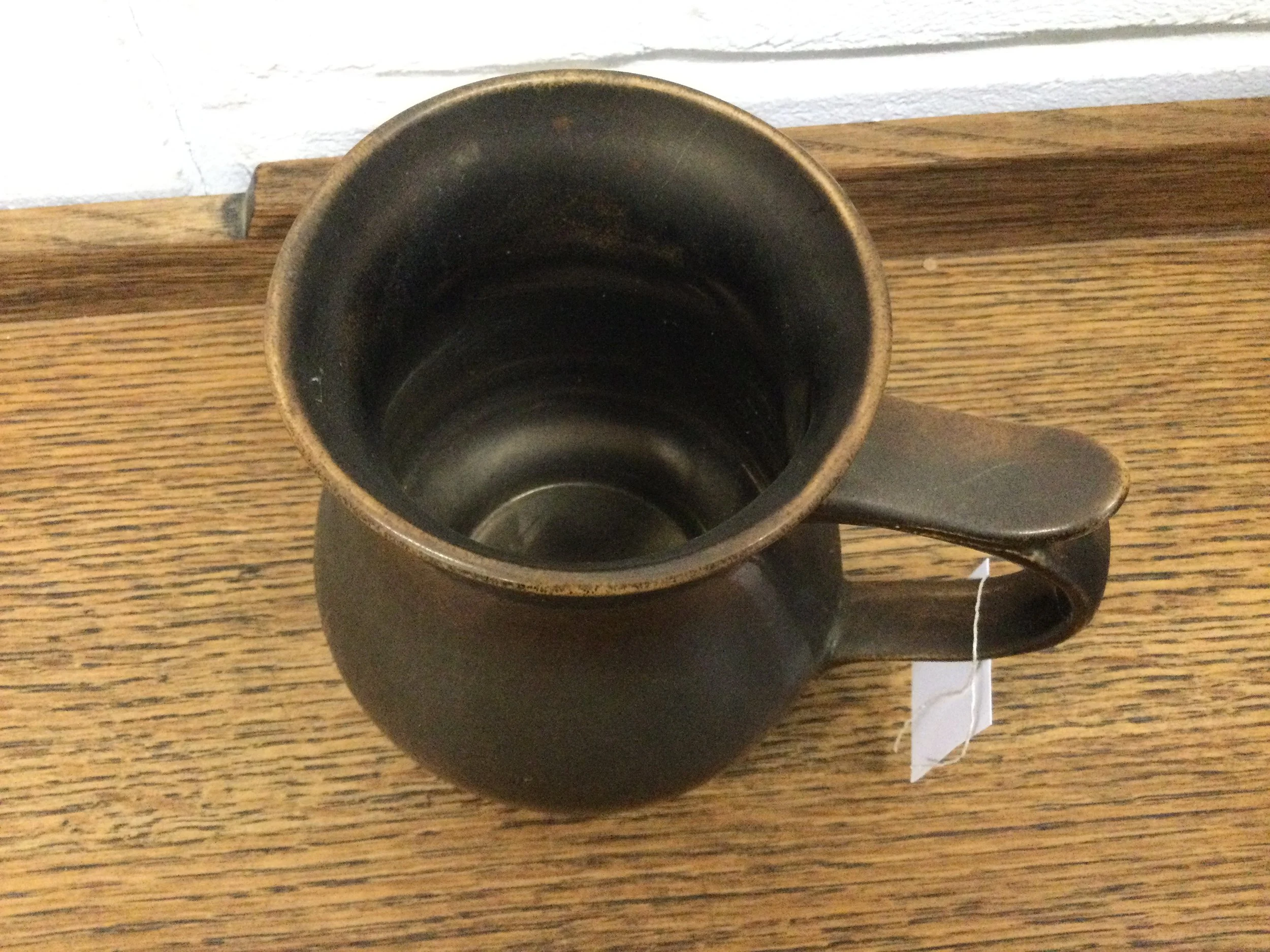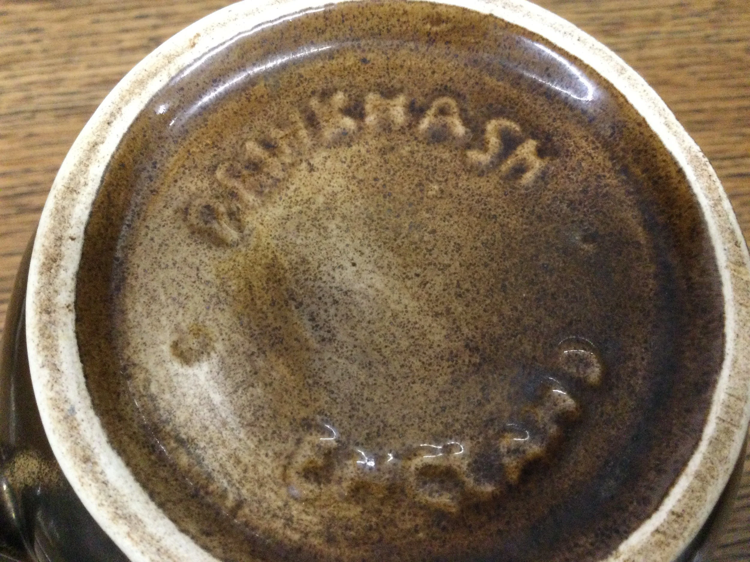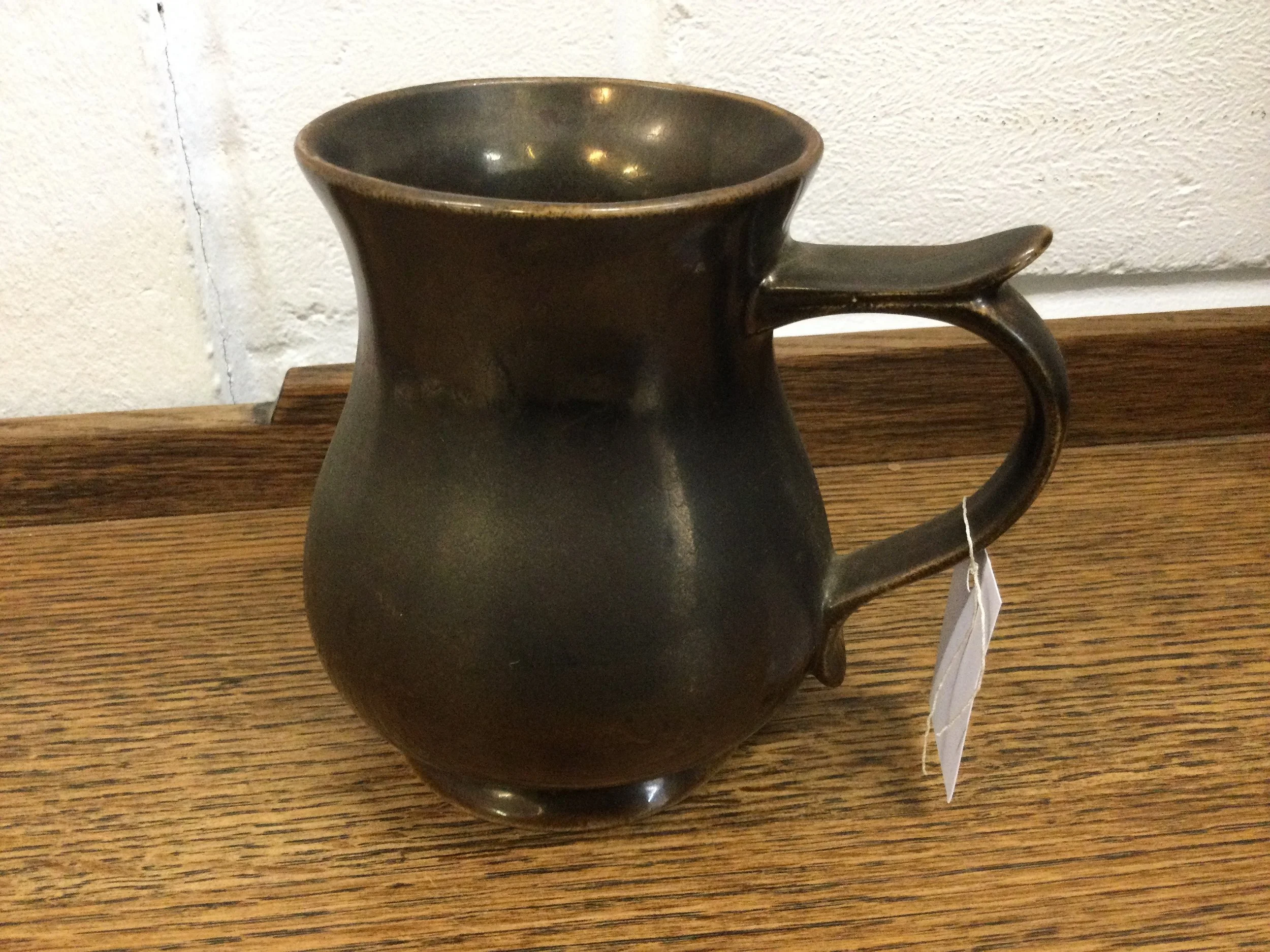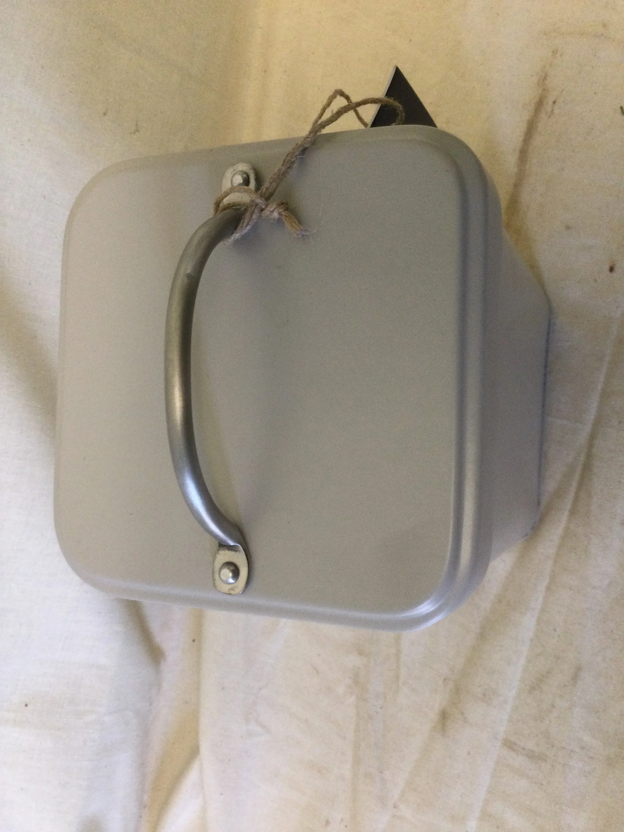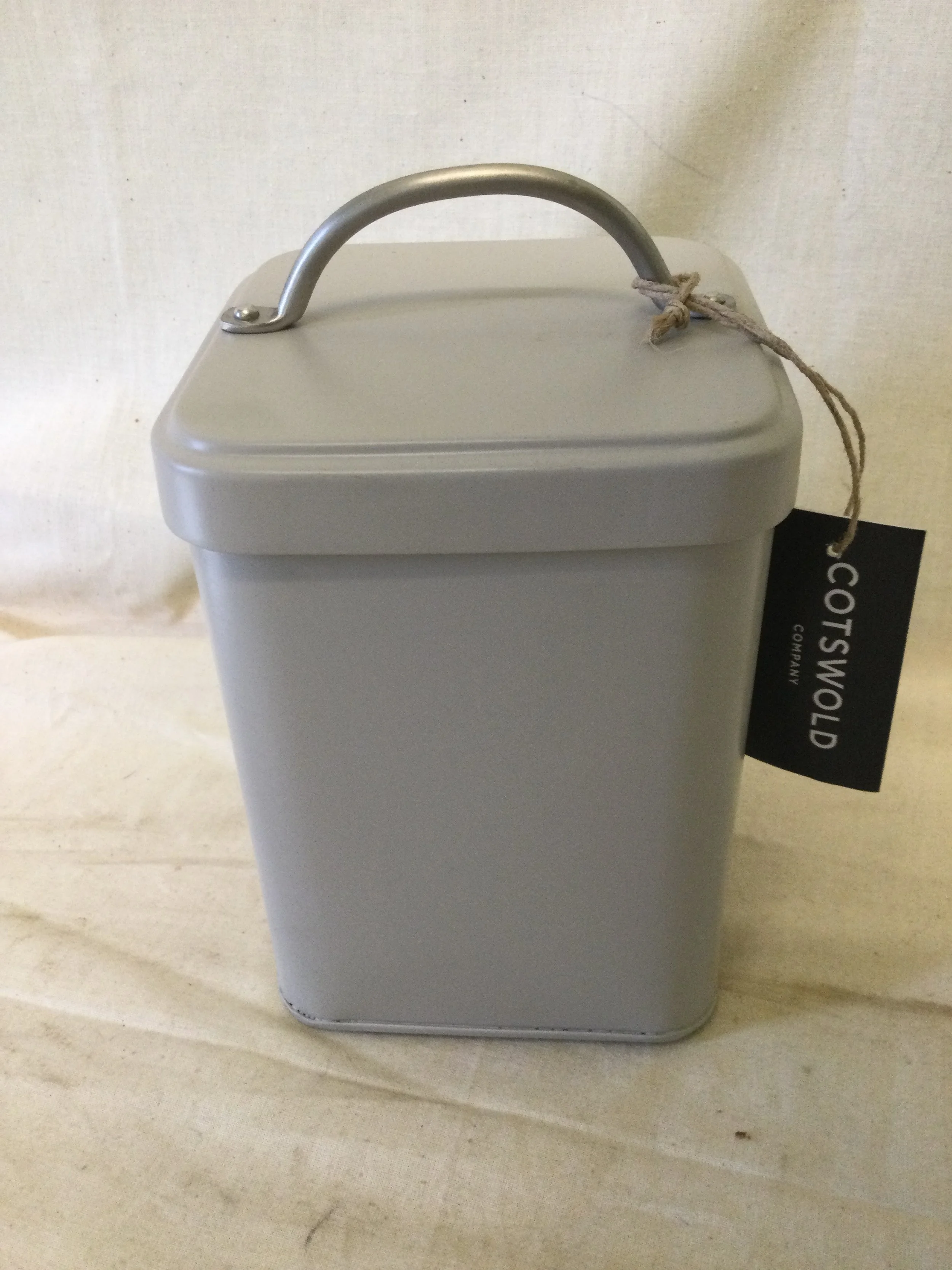 White round plastic golf ball shaped ice bucket. A gold coloured metal golfing figure forms the handle. The ice bucker has an internal glass liner. It measures 29 cm tall x 17 cm diameter